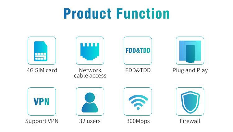 Il s'agit d'une vitesse de transmission de routeur WiFi CAT 4 4G jusqu'à 300 Mbps, vitesse 4G jusqu'à 150 Mbps, TDD-LTE : 150 Mbps DL / 50 Mbps UL TD-SCDMA : 2,8 Mbps DL / 2,2 Mbps UL. Le terminal peut prendre en charge trois modes de communication : TDD FDD, WCDMA. Il prend en charge l'accès Internet/le mode de travail PPPoE, utilise une carte SIM 4G, peut se connecter au modem en mode passerelle, équipé de 4 interfaces LAN, peut se connecter simultanément à d'autres appareils. Il est facile à connecter et facile à transporter en main. Partage du client avec 32 utilisateurs WiFi, il suffit d'insérer la carte SIM, puis vous pourrez profiter du WiFi avec ce routeur 4G LTE portable.