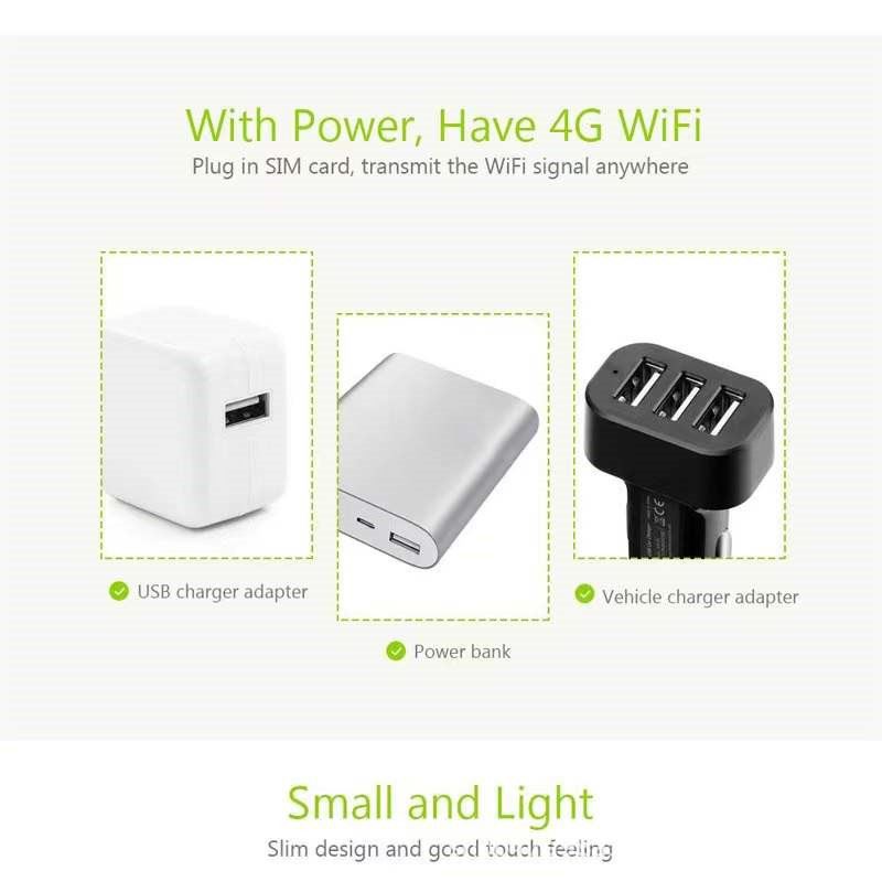 * Partage de connexion Internet, jusqu’à 10 utilisateurs peuvent accéder au réseau Wi-Fi en même temps. pas besoin d’installer un logiciel (mode WiFi), travailler avec une alimentation externe, pas de temps de travail limité.